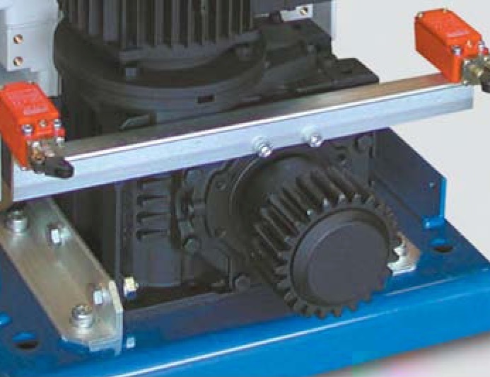 Передаточный вал закреплен к регулировочной механической муфте, червячная передача из бронза — стали смонтирована на шарикоподшипниках в масляной ванне. Нереверсивная червячная передача обеспечивает блокировку полотна в любом положении останова. В случае, если прерывается электропитание, благодаря устройству ручной блокировки, полотно свободно двигается вручную.